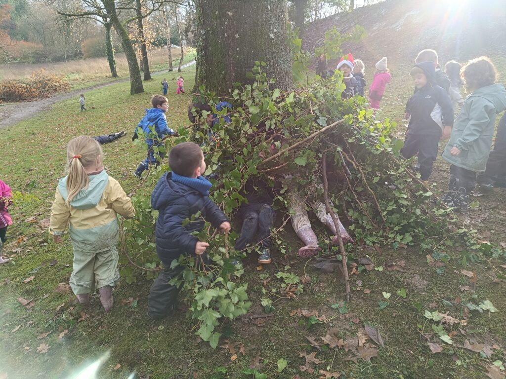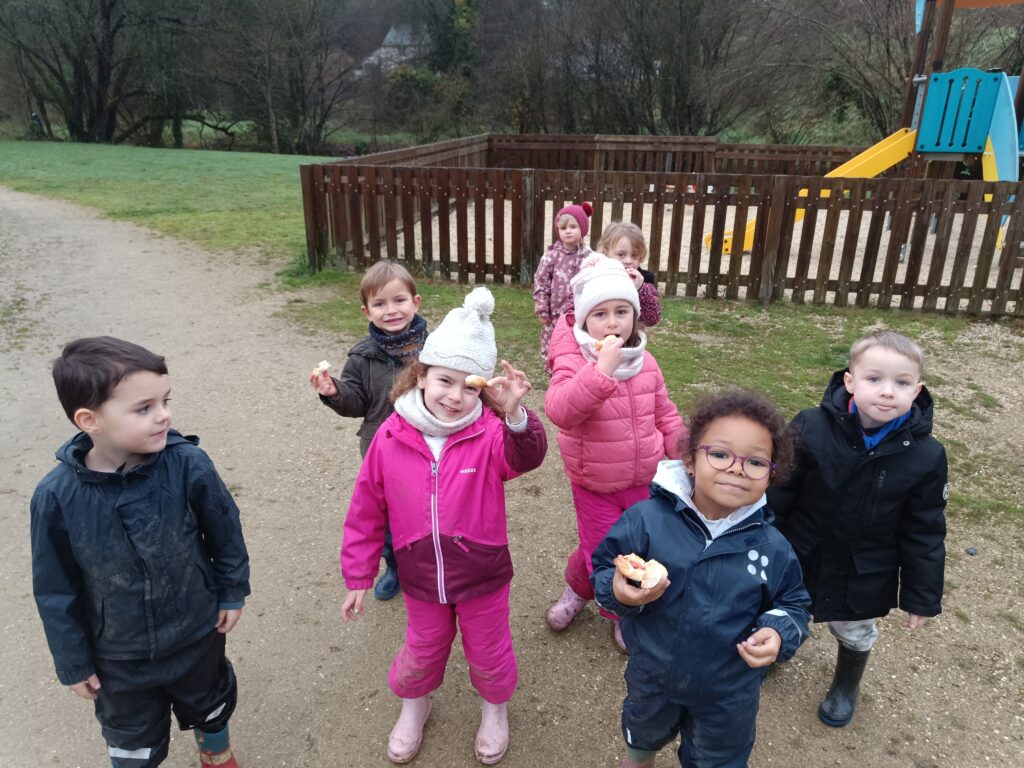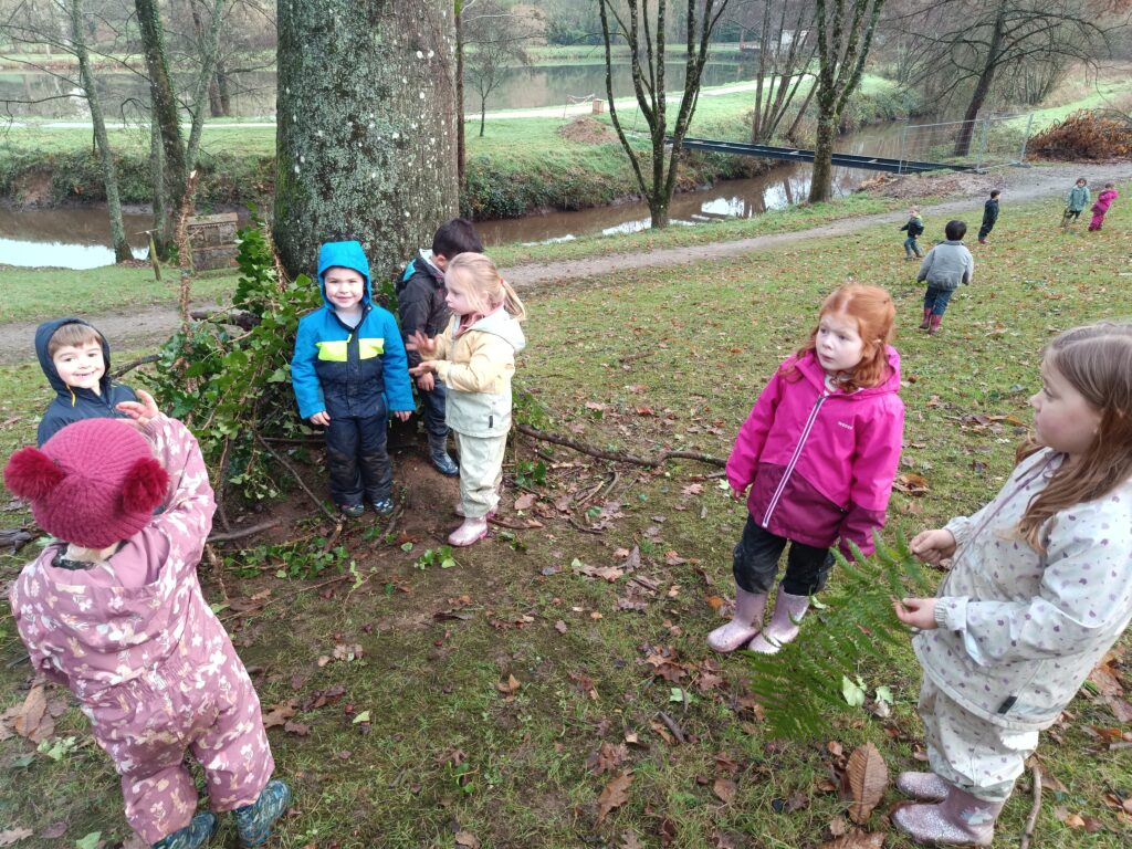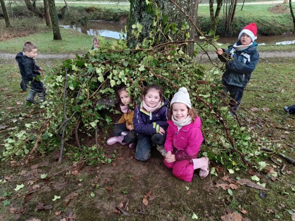 Aussi, nous sommes allés en école dehors où nous avons passé un grand temps à jouer et à observer la nature. Nous avons enlevé de très grandes branches de lierre qui grimpaient aux arbres. Il fallait se mettre à plusieurs pour la porter et ne pas la casser. Avec, certains enfants ont fait des guirlandes entre les arbres, d’autres ont recouvert les cabanes déjà construites précédemment notamment par Mme Perret. Nous avons aussi mangé les Joulutorttu confectionnés la veille lors de notre temps fort de Noël et escalader notre chemin d’aventure très glissant.