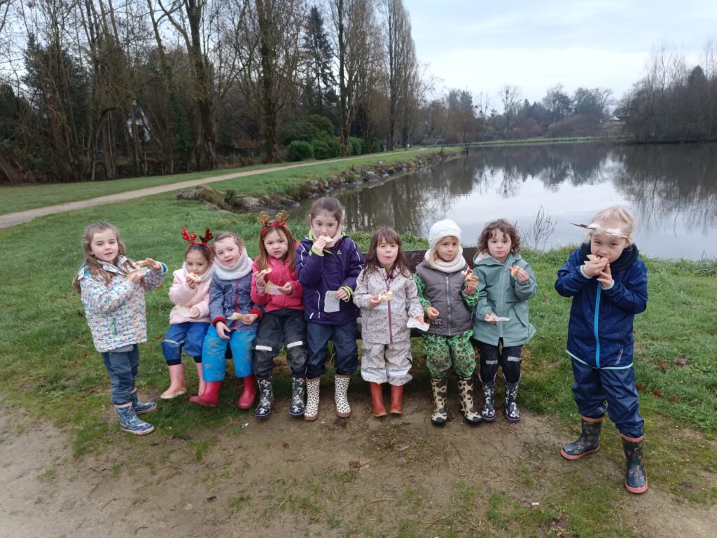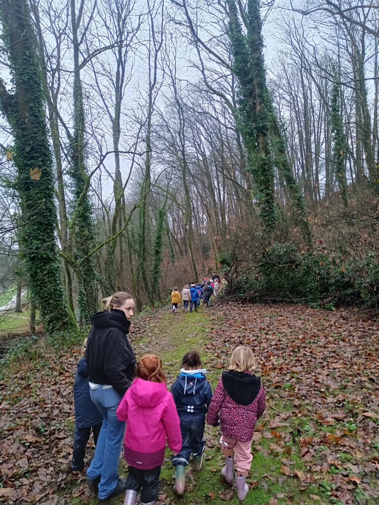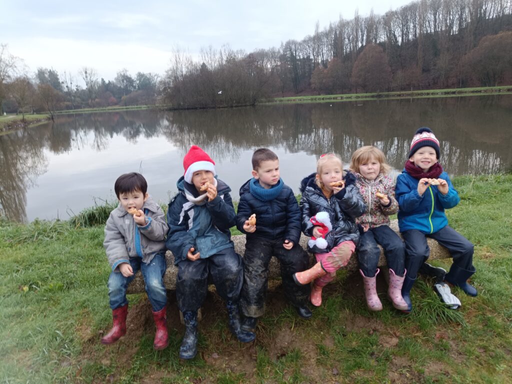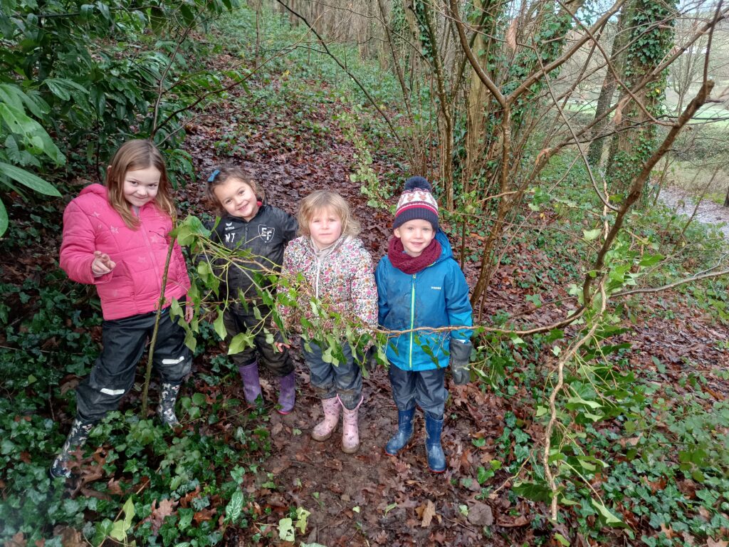 Aussi, nous sommes allés en école dehors où nous avons passé un grand temps à jouer et à observer la nature. Nous avons enlevé de très grandes branches de lierre qui grimpaient aux arbres. Il fallait se mettre à plusieurs pour la porter et ne pas la casser. Avec, certains enfants ont fait des guirlandes entre les arbres, d’autres ont recouvert les cabanes déjà construites précédemment notamment par Mme Perret. Nous avons aussi mangé les Joulutorttu confectionnés la veille lors de notre temps fort de Noël et escalader notre chemin d’aventure très glissant.