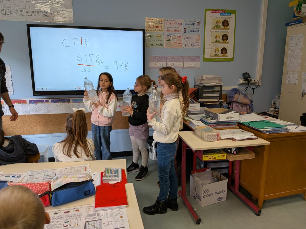 Ce matin, dans la classe de CE1 et CE2 de Mme Jeusselin Brault, les élèves ont bénéficié d’une intervention sur le tri des déchets.