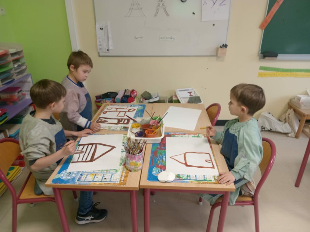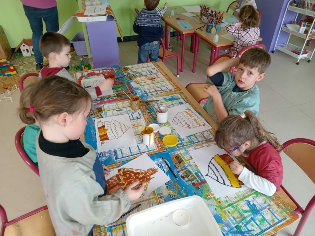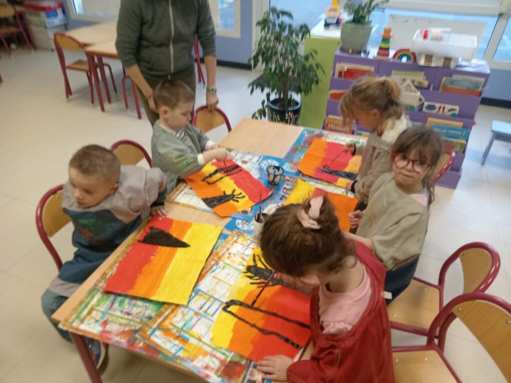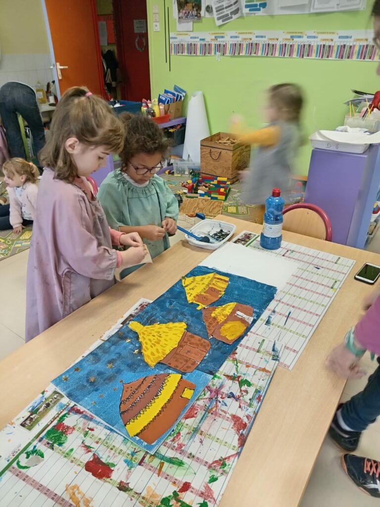 Un échantillon de ce que nous payons en ce moment mais que vous pouvez voir dans le couloir : cases, Africaines, éléphants, girafes. Nous nous entrainons et apprenons à dessiner.