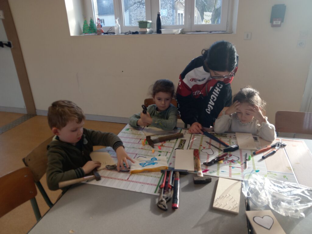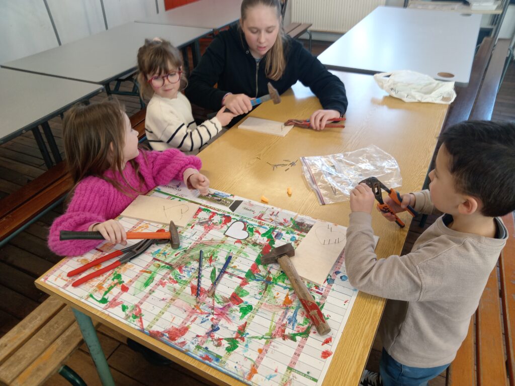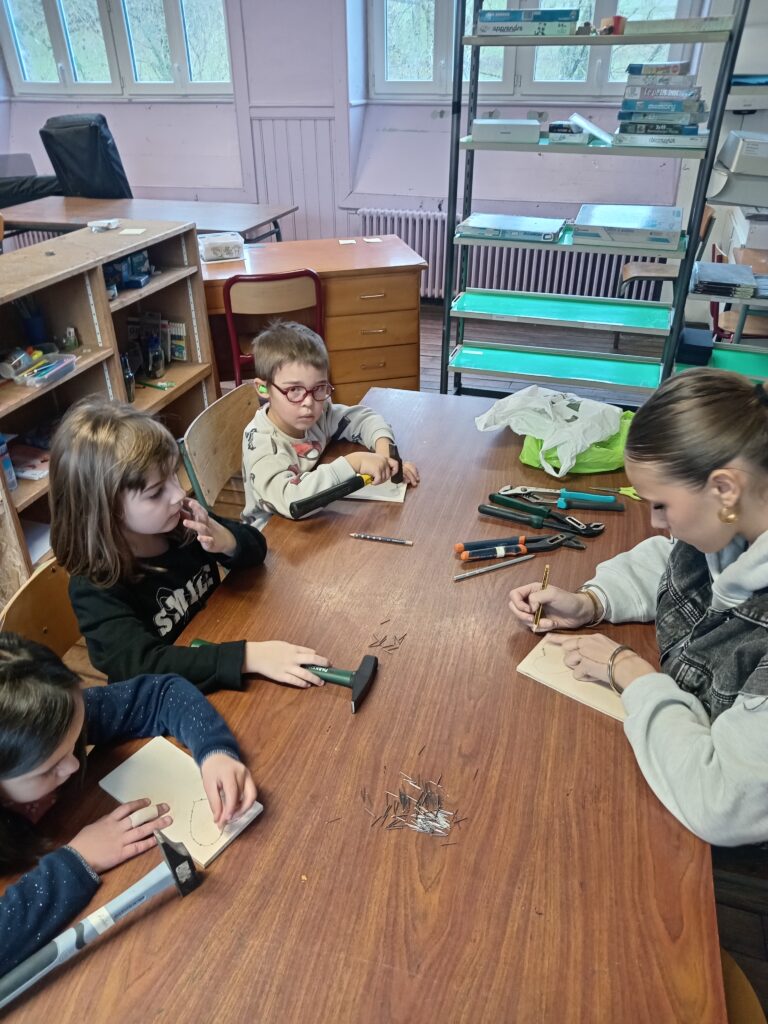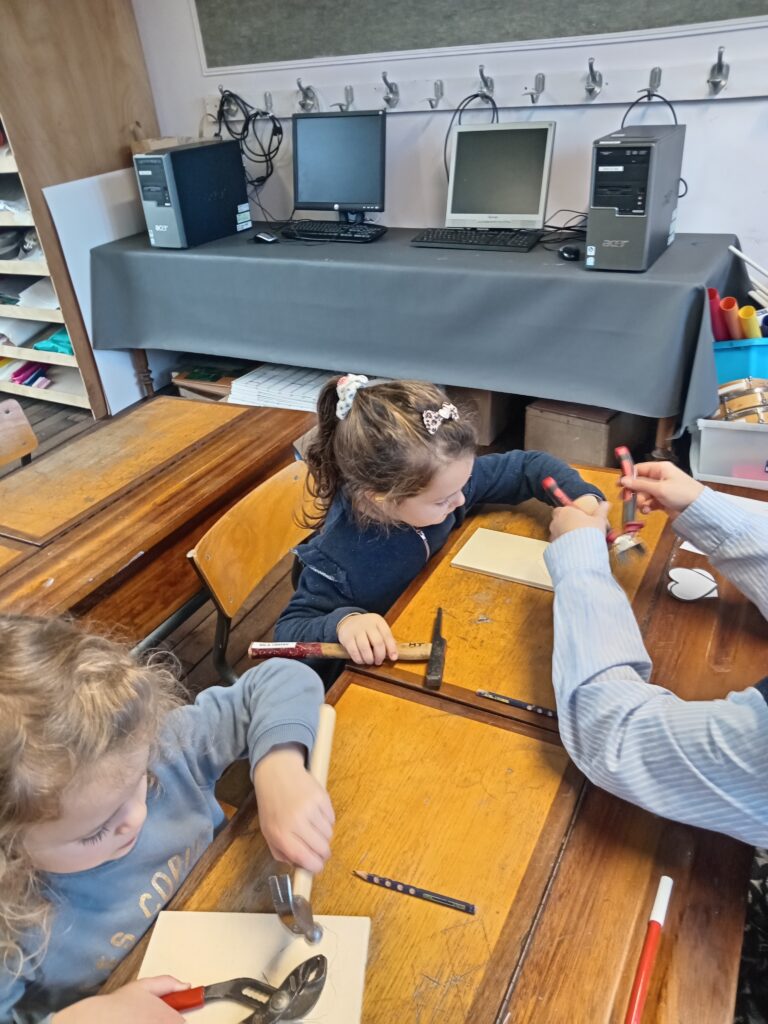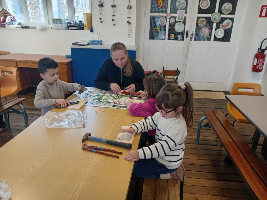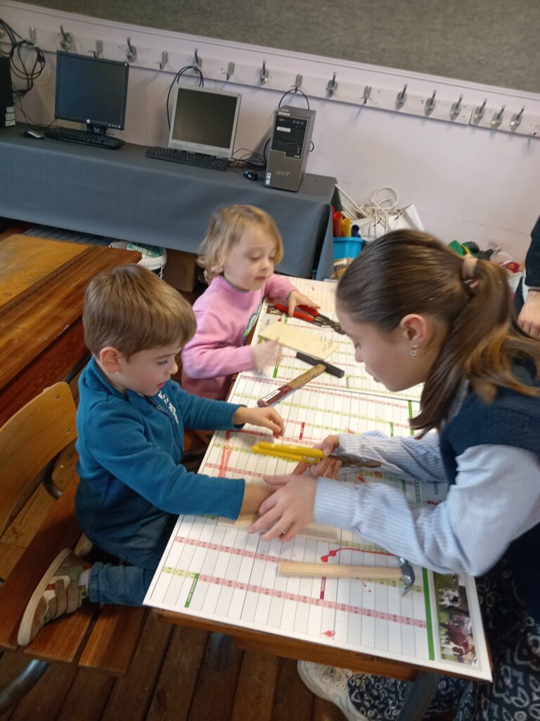 Pendant cette période 3, des collégiens de Rochefeuille accompagnent les élèves de maternelle pour un projet qui nécessitait ce materiel. Les maitresses ont apporté les clous et les planches.