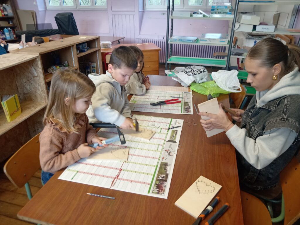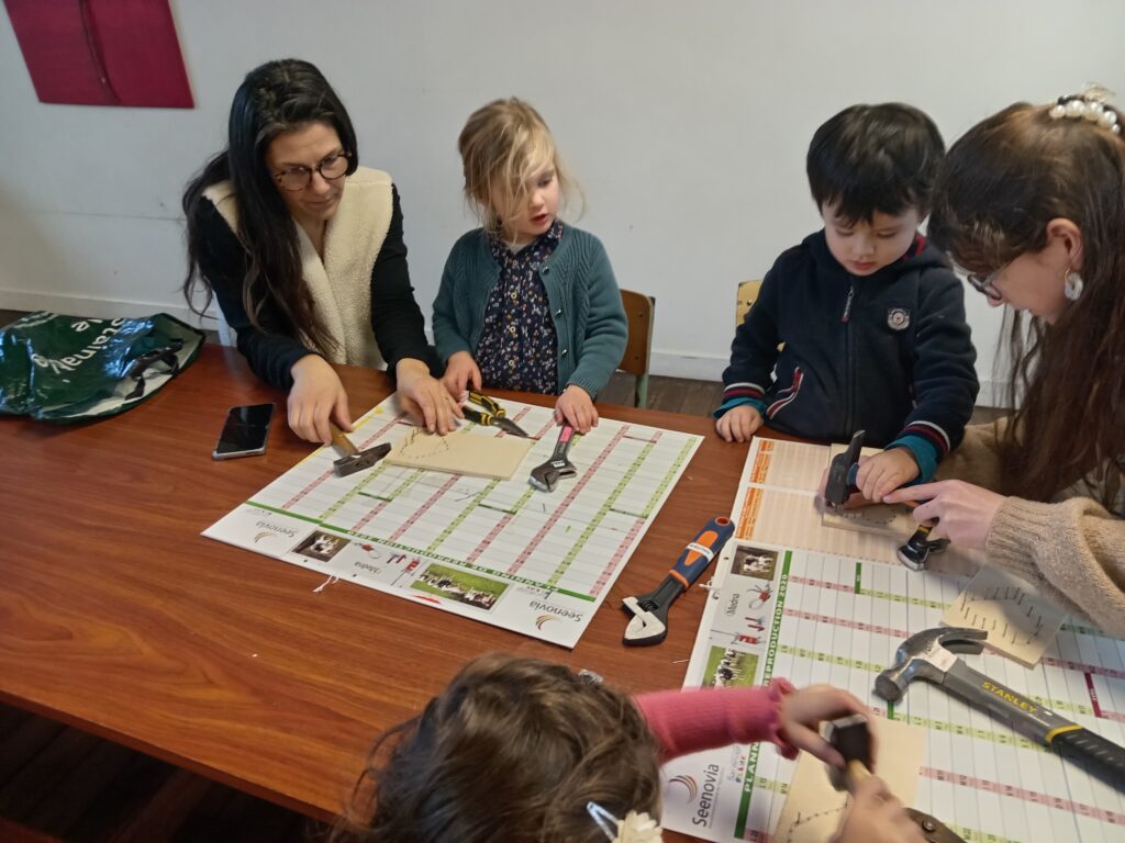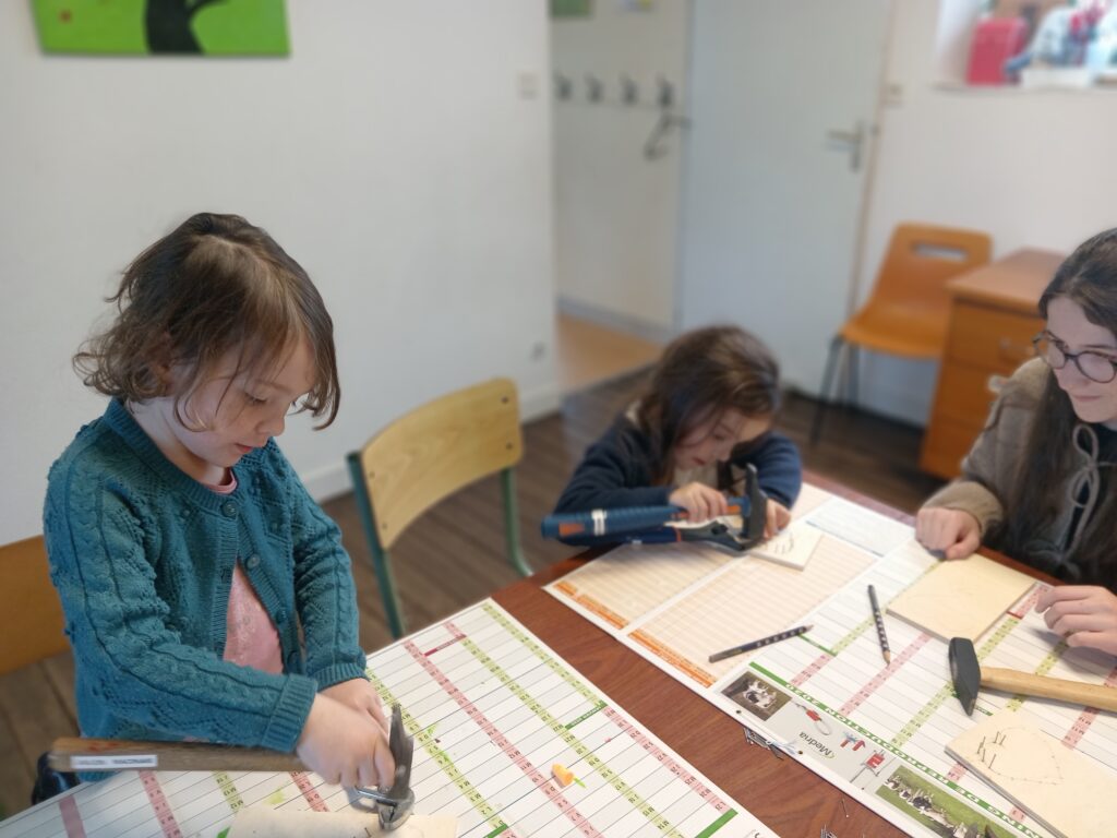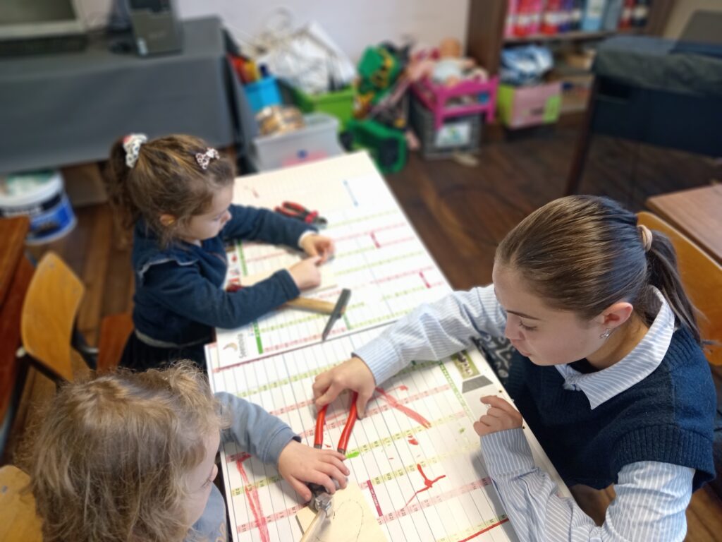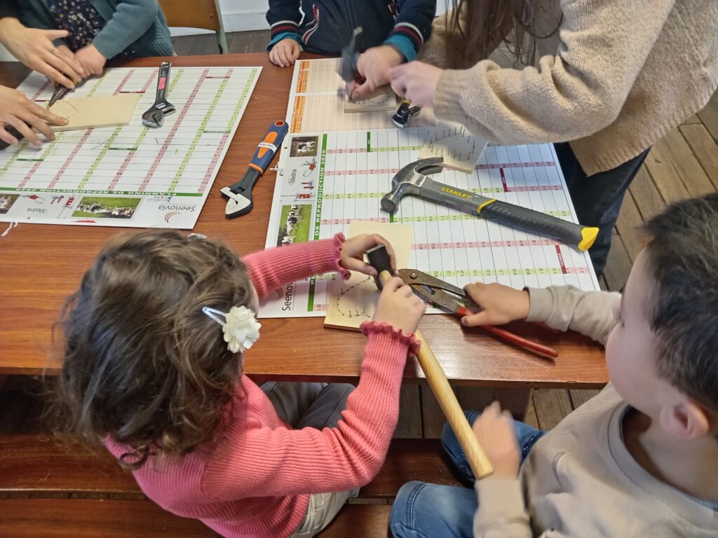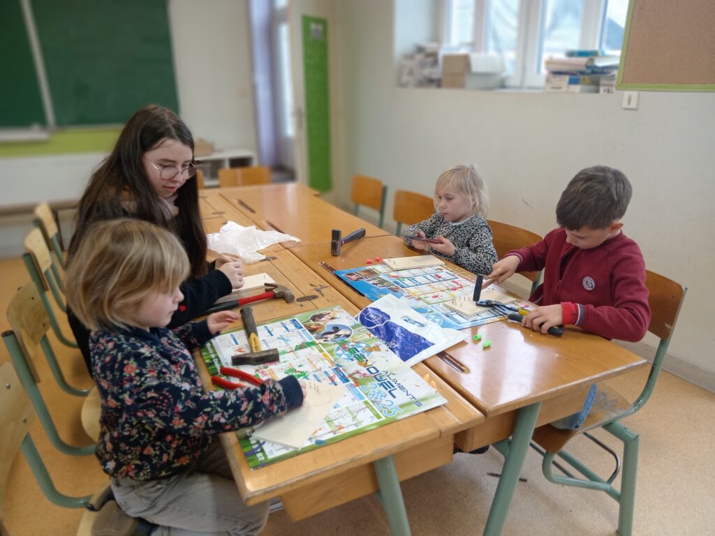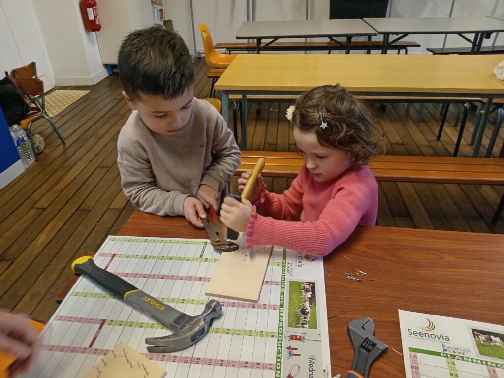 Pendant cette période 3, des collégiens de Rochefeuille accompagnent les élèves de maternelle pour un projet qui nécessitait ce materiel. Les maitresses ont apporté les clous et les planches.